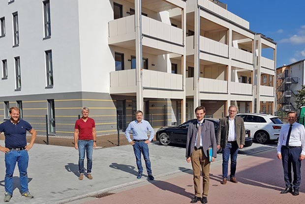 Blödt sprach mit ihnen ebenfalls über die Lage am Holzmarkt und besichtigte mit ihnen ein vierstöckiges Wohnhaus in Holzbauweise mit 13 Wohnungen in Weiden. Es wurde in der ressourcensparenden Tafelbauweise errichtet. Semmler ergänzt dazu: „Wir wollen zeigen, dass wir Holz effektiv und ressourcenschonend einsetzen – das ist auch mit dem Holzrahmenbau möglich. Und das müssen wir den Politikern erklären.“